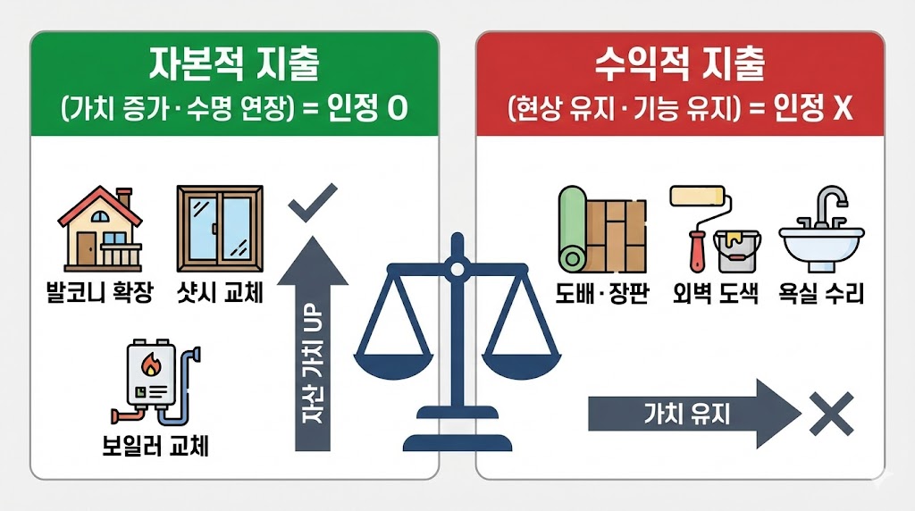 국세청이 비용을 인정하는 기준은 단순합니다. **"그 돈을 써서 집의 수명이 늘어나거나 가치가 올랐는가?"**입니다.