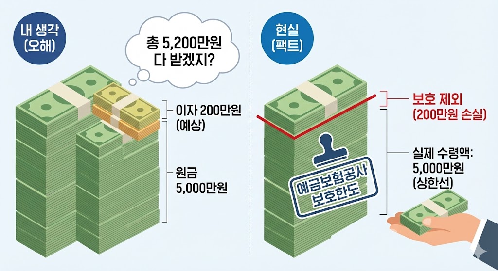 - 결과: 원금 5,000만 원 + 그동안 쌓인 이자가 5,100만 원이 되어도, 예금보험공사는 딱 5,000만 원까지만 돌려줍니다. 나머지 100만 원은 허공으로 사라집니다.