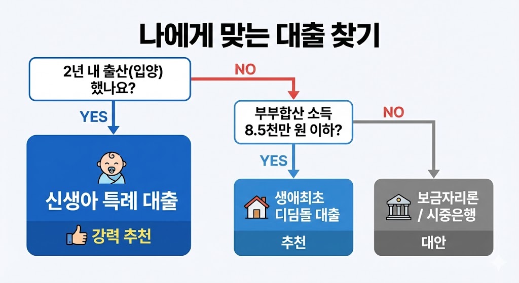 아래 이미지는 독자의 상황(출산 여부, 소득)에 따라 어떤 대출 상품이 적합한지 보여주는 플로우차트(결정 트리)입니다. "2년 내 출산했나요?"라는 첫 질문에서 YES면 '신생아 특례(강력 추천)'로, NO면 "소득 8.5천만 원 이하인가요?"로 이어집니다. 소득이 이하면 '생애최초 디딤돌(추천)'로, 초과면 '보금자리론/시중은행(대안)'으로 연결되어 독자가 쉽게 자신의 포지션을 찾을 수 있습니다.