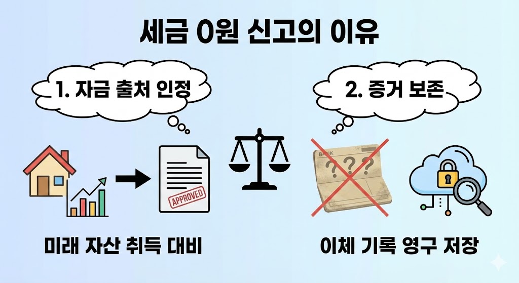 아래 이미지는 증여세가 0원이라도 신고해야 하는 두 가지 핵심 이유(자금 출처 인정, 증거 보존)를 시각적으로 설명한 인포그래픽입니다. 미래의 자산 취득에 대비하고, 오래된 통장 대신 디지털 기록으로 영구 보존하는 이점을 대조적으로 보여줍니다.