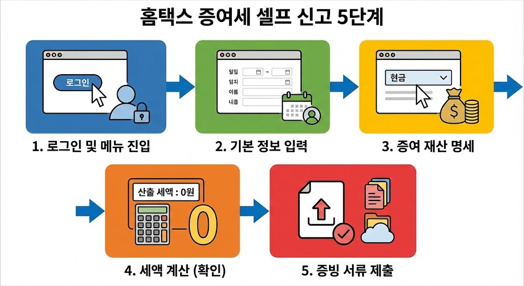 아래 이미지는 국세청 홈택스에서 증여세를 신고하는 핵심 5단계(로그인 → 기본 정보 → 재산 입력 → 세액 계산 → 서류 제출)를 알기 쉬운 아이콘과 흐름도로 표현한 인포그래픽입니다. 복잡한 과정을 단순화하여 초보자도 쉽게 따라 할 수 있음을 강조했습니다.