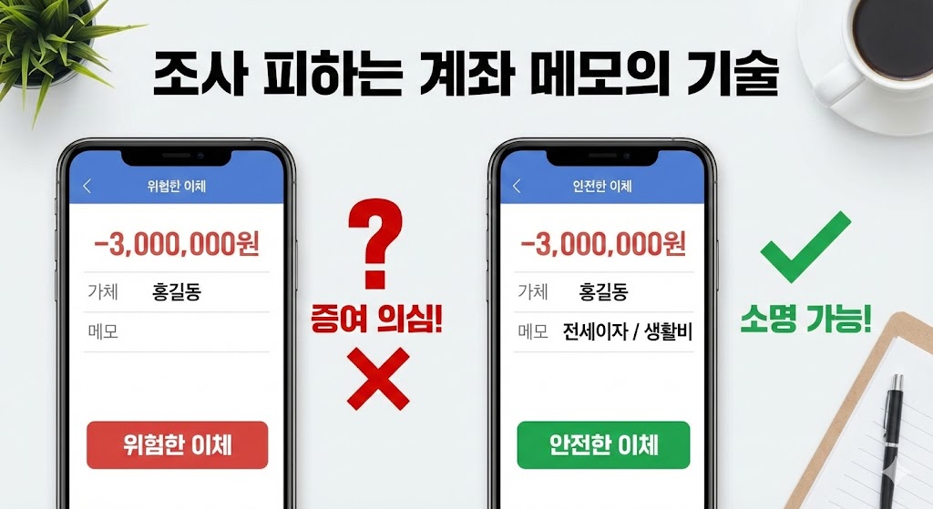 아래 이미지는 가족에게 돈을 보낼 때 이체 메모(적요)를 남기는 것의 중요성을 보여주는 이미지입니다. 메모 없이 이름만 적힌 '위험한 이체'는 증여로 의심받지만, '전세이자'처럼 목적을 명시한 '안전한 이체'는 추후 소명이 가능하다는 것을 시각적으로 비교했습니다.
