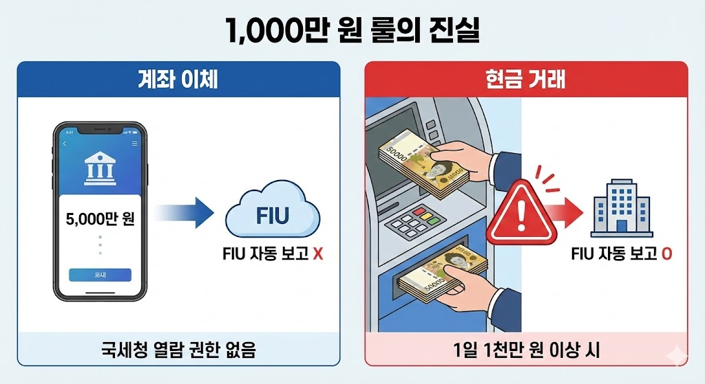 많은 분들이 오해하는 **'천만 원 룰'**은 국세청이 아니라 **금융정보분석원(FIU)**의 기준입니다.