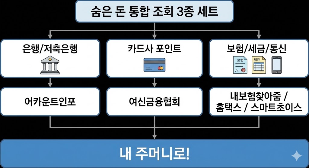 아래 이미지는 글에서 소개한 세 가지 주요 숨은 돈(은행/저축은행, 카드사 포인트, 보험/세금/통신)과 각각을 조회할 수 있는 대표적인 서비스(어카운트인포, 여신금융협회, 내보험찾아줌 등)를 매칭하여 보여주는 플로우차트입니다. 모든 과정이 결국 '내 주머니'로 돈이 들어오는 결과로 이어진다는 것을 시각적으로 명확하게 정리했습니다.