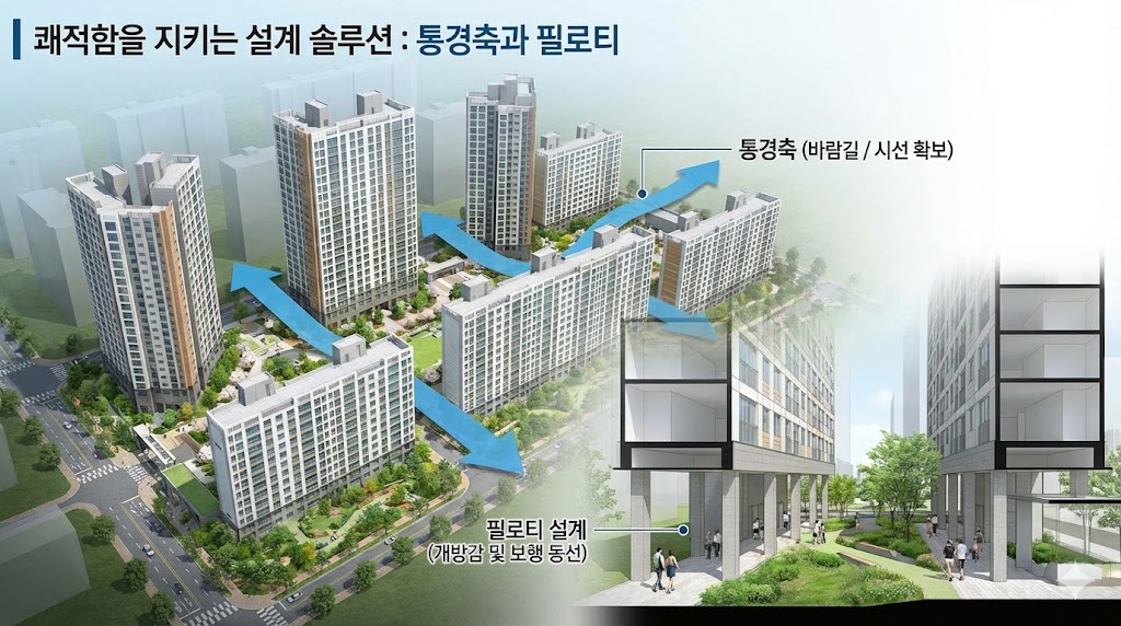아래 이미지는 고층 아파트 단지의 쾌적함을 높여주는 설계 요소인 '통경축'과 '필로티'를 설명하는 인포그래픽입니다. 단지 조감도 위에 건물 사이로 바람과 시선이 통하는 넓은 길을 파란색 화살표로 표시하여 '통경축'을 설명하고, 별도의 확대 그림을 통해 1층을 비워 보행 동선과 개방감을 확보하는 '필로티' 구조를 구체적으로 보여줍니다.