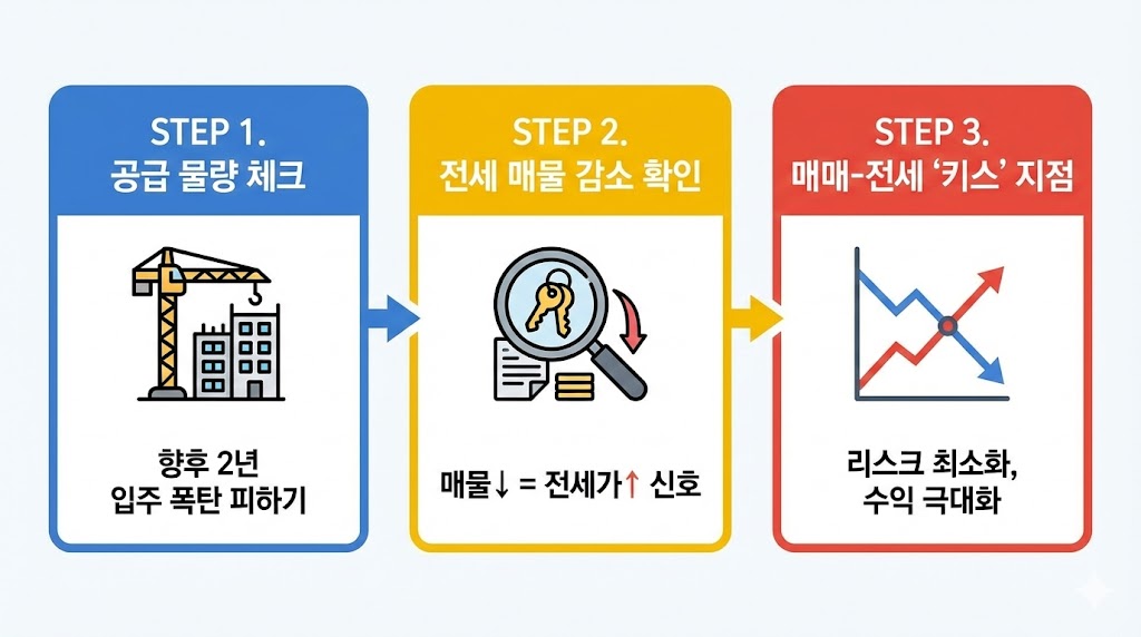 아래 이미지는 갭투자 성공을 위한 실전 3단계 전략을 보여주는 플로우차트 인포그래픽입니다. 'STEP 1. 공급 물량 체크'에서는 향후 입주 폭탄을 피하는 것을, 'STEP 2. 전세 매물 감소 확인'에서는 매물 감소가 전세가 상승의 신호임을, 'STEP 3. 매매-전세 키스 지점'에서는 두 가격이 만나는 지점이 리스크 최소화 및 수익 극대화의 포인트임을 각각의 아이콘과 함께 단계별로 보여줍니다.