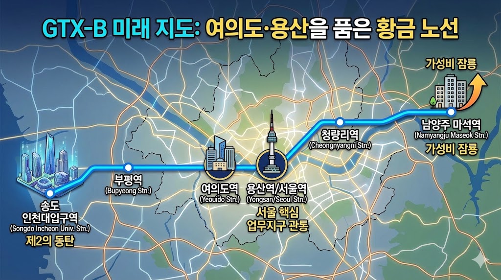 이제 시장의 눈은 **GTX-B(인천 송도 ~ 남양주 마석)**로 향하고 있습니다. A노선이 보여준 학습 효과를 통해, B노선에서 우리는 어떤 기회를 잡아야 할까요?