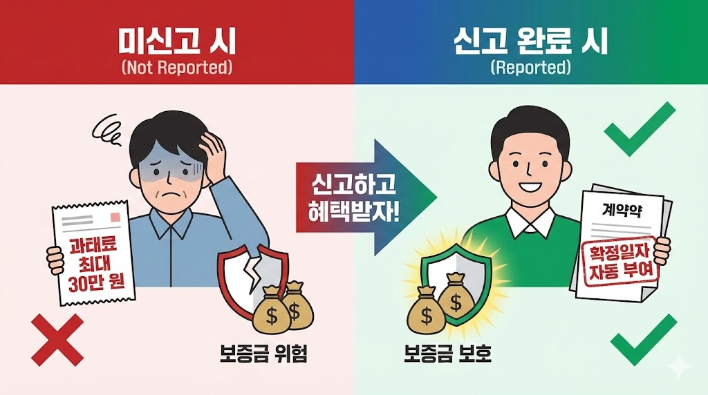 [그림 2] 미신고 시 불이익 vs 신고 시 혜택 비교. 신고를 안 하면 아까운 과태료를 물지만, 신고를 하면 확정일자를 자동으로 받아 내 보증금을 안전하게 지킬 수 있습니다.