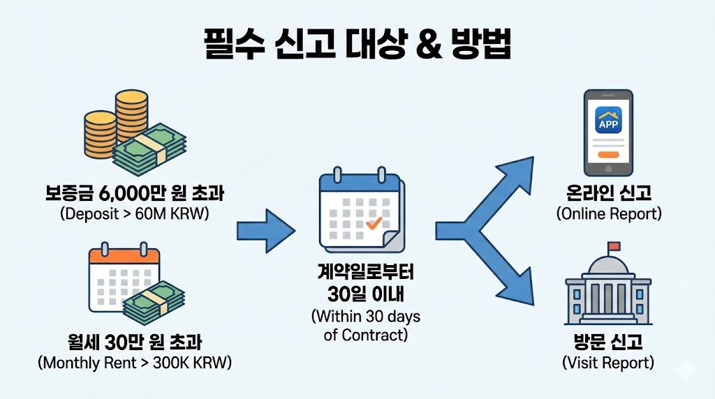 아래 이미지는 복잡할 수 있는 신고 대상 기준(보증금 6,000만 원 또는 월세 30만 원 초과)과 신고 기한(계약일로부터 30일 이내), 그리고 두 가지 신고 방법(온라인, 방문)을 직관적인 아이콘과 흐름도로 한눈에 파악할 수 있도록 정리한 가로형 인포그래픽입니다.