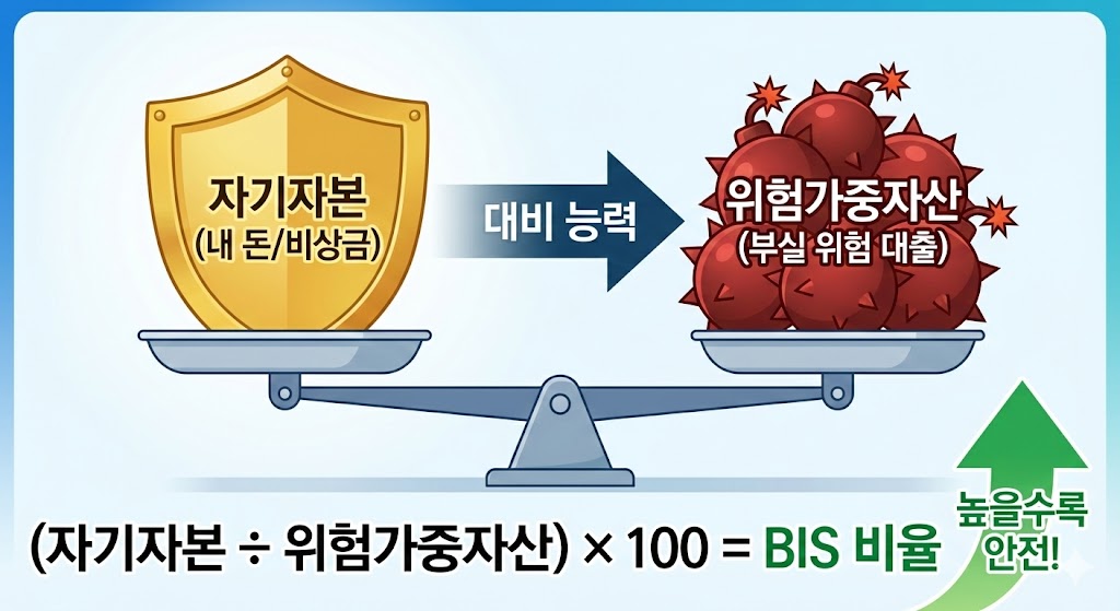 ▲ BIS 비율은 은행의 '기초 체력'입니다. 내가 맡긴 돈(자기자본)으로 위험한 대출(위험가중자산)을 얼마나 감당할 수 있는지 보여주는 지표로, 이 수치가 높을수록 은행이 튼튼하다는 뜻입니다.