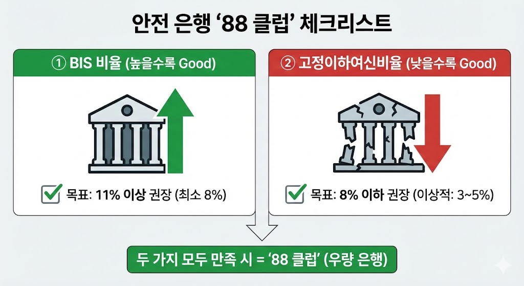 ▲ 진짜 알짜배기 은행을 찾는 기준, '88 클럽'. BIS 비율은 8% 이상(권장 11% 이상)으로 높고, 고정이하여신비율은 8% 이하로 낮은 곳이 진정한 우량 은행입니다. 이 두 가지 조건을 모두 통과하는지 꼭 확인하세요.