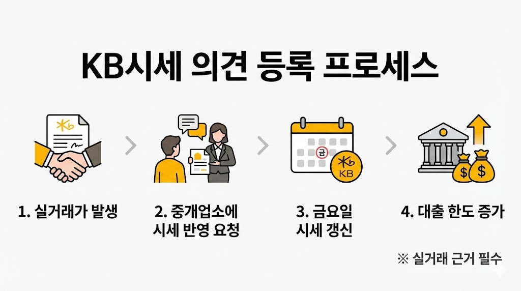 가장 강력한 방법입니다. 우리 단지 실거래가는 10억인데 KB시세가 9억이라 대출이 부족하다면? KB부동산 사이트 내 [시세 의견 등록] 메뉴를 이용하거나, 단지 내 **'KB시세 모니터링 공인중개사'**에게 자료(최근 실거래 내역, 매매 계약서)를 들고 찾아가십시오. *"실거래가 이렇게 떴으니 시세 좀 올려주세요"*라고 요청하면, 타당성 검토 후 다음 주 금요일에 시세가 즉각 반영될 수 있습니다.