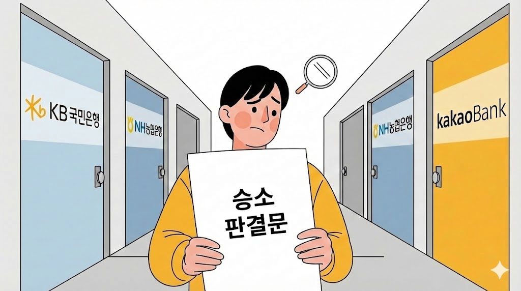 아래 이미지는 승소 판결문을 들고 기뻐하지만 정작 당장 손에 쥔 현금이 없어 곤란해하는 채권자의 모습과, 여러 은행(국민, 농협, 카카오 등) 로고가 그려진 문 앞에서 어느 문을 열어야 할지 고민하는 상황을 돋보기 아이콘과 함께 직관적으로 표현한 일러스트입니다.