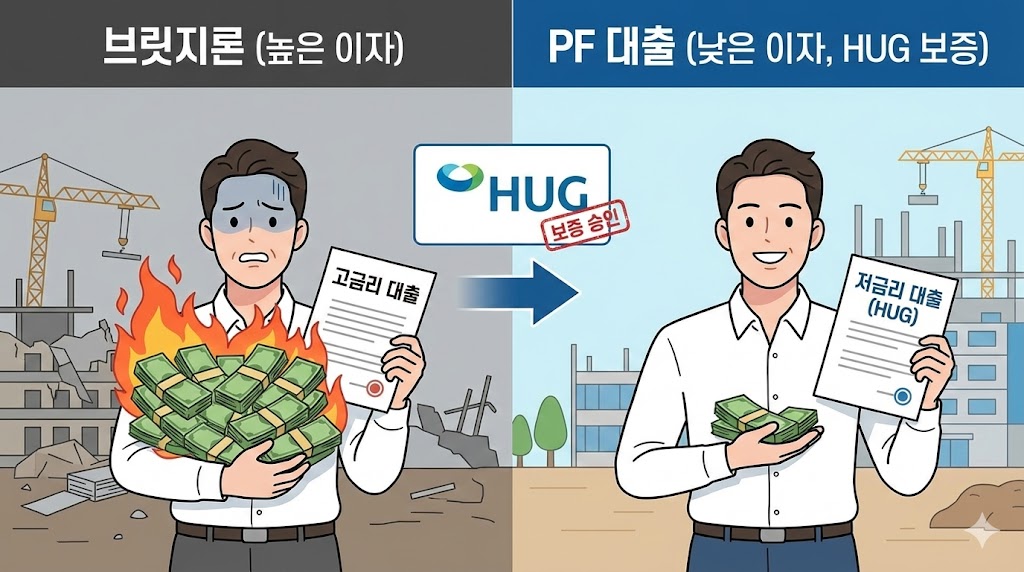 이때 구세주처럼 등장하는 것이 바로 HUG(주택도시보증공사)입니다. 국가가 운영하는 공공기관인 HUG가 은행에 "이 사업장이 혹시라도 망해서 돈을 못 갚으면, 우리가 대신 확실하게 갚아줄게!"라고 든든한 보증서를 써주는 것입니다. 은행 입장에서는 국가 기관이 보증을 서주니 돈을 떼일 염려가 사라지고, 그 안전한 대가로 이자를 대폭 깎아주게 됩니다. 살인적인 브릿지론을 쓰던 사업장도 HUG 보증을 받아 본 PF 대출로 무사히 넘어가면, 금리가 절반 가까이 뚝 떨어지는 마법 같은 비용 절감 효과를 경험할 수 있습니다.