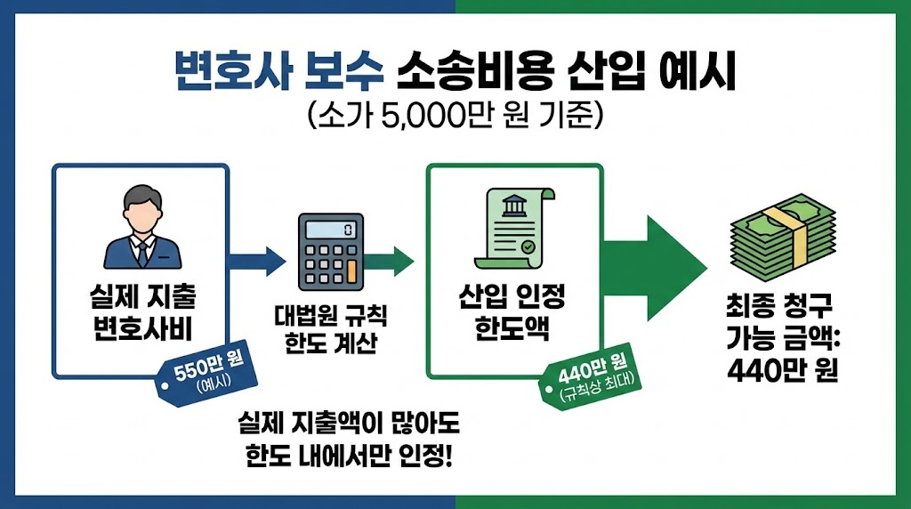 아래 이미지는 글로만 보면 이해하기 어려운 '변호사 보수 산입 규칙'을 구체적인 예시를 통해 보여주는 인포그래픽입니다. 소가 5,000만 원 사건에서 실제 지출한 변호사비(예: 550만 원)와 대법원 규칙상 인정 한도(440만 원)를 비교하여, 결국 '한도' 내의 금액만 돌려받을 수 있다는 핵심 원리를 직관적으로 설명합니다.