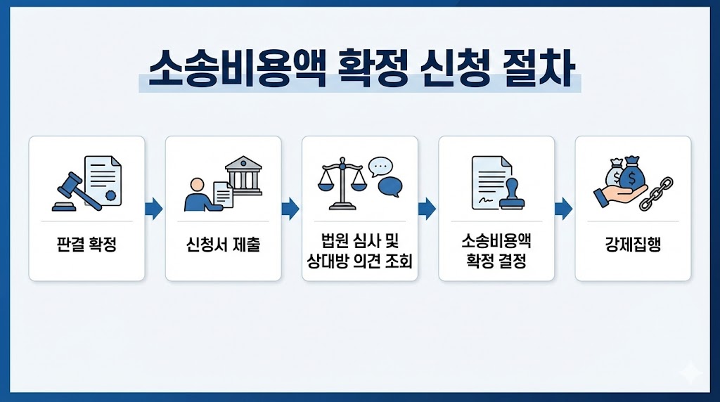 아래 이미지는 소송비용을 상대방에게 청구하기 위한 법적 절차를 5단계로 알기 쉽게 시각화한 흐름도입니다. '판결 확정'에서 시작하여 '신청서 제출', '법원 심사'를 거쳐 최종 '강제집행'에 이르기까지의 과정을 아이콘과 함께 보여주어, 복잡한 절차를 한눈에 파악할 수 있도록 디자인했습니다.