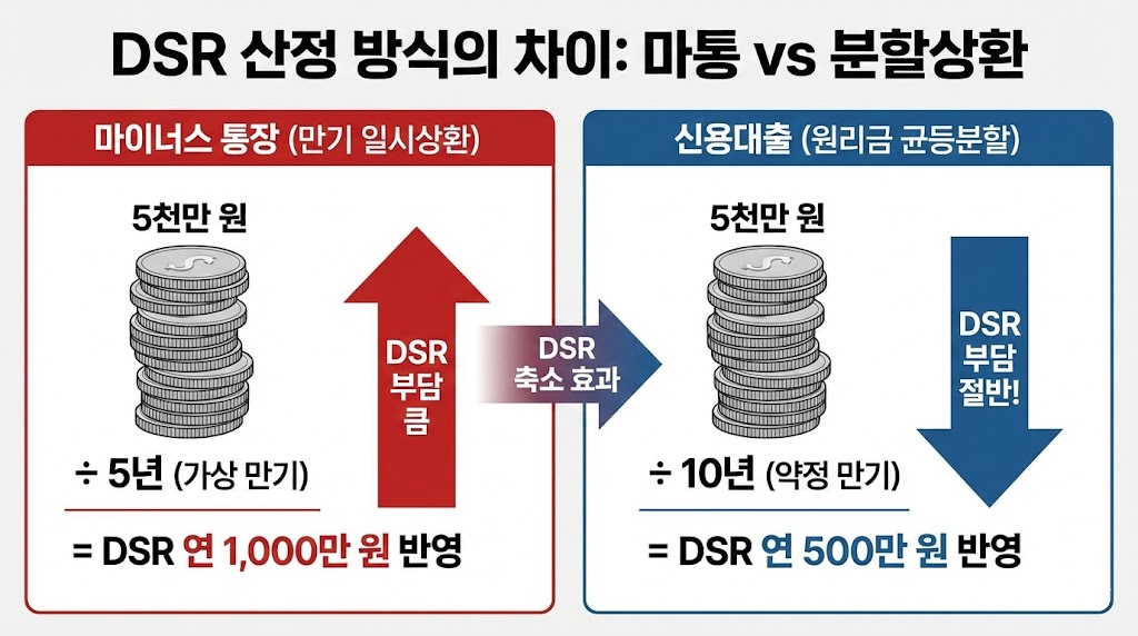 DSR은 **[연간 갚아야 할 원리금 / 연 소득]**입니다. 분자(원리금)를 줄이면 DSR은 내려갑니다. 바로 여기에 '마이너스 통장'의 함정과 해법이 숨어 있습니다.