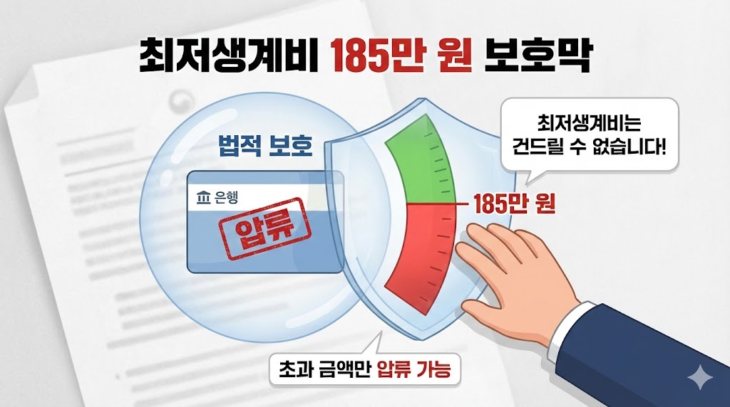 아래 이미지는 법이 보장하는 최저생계비 185만 원까지는 그 어떤 압류로부터도 안전하다는 사실을 직관적으로 표현했습니다.