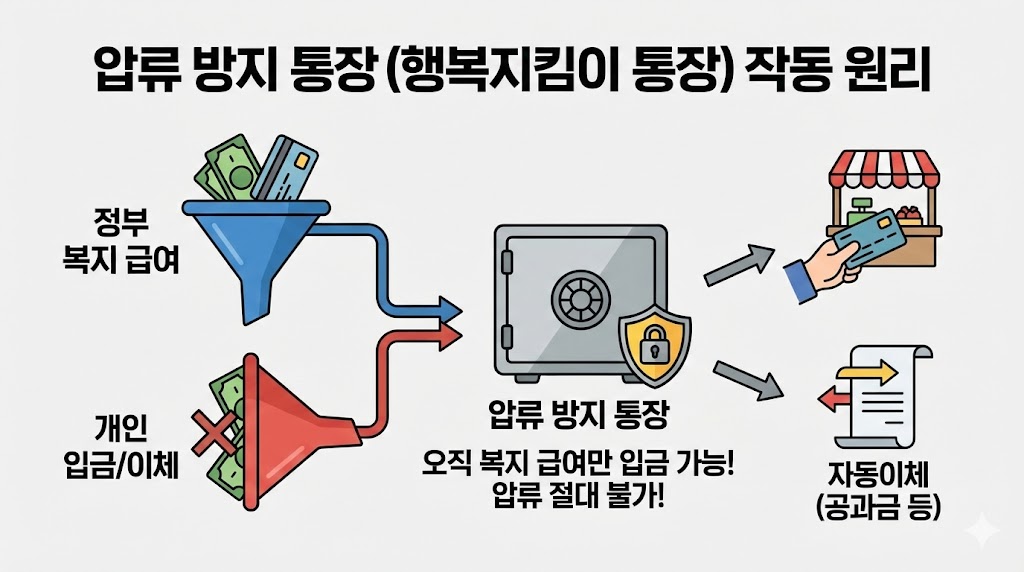 기존에 묶인 돈을 푸는 것만큼이나, 혹은 그보다 더 중요한 것이 '앞으로 들어올 돈'을 안전하게 지키는 것입니다. 내가 당장 생계 유지를 위해 받아야 할 기초생활수급비나 한부모가족 지원금 같은 피 같은 복지 급여가 일반 통장으로 들어왔다가 또 압류당하면 숨이 턱 막히겠죠? 이를 원천적으로 100% 차단하는 마법의 통장이 바로 **'압류 방지 전용 통장(행복지킴이 통장)'**입니다.