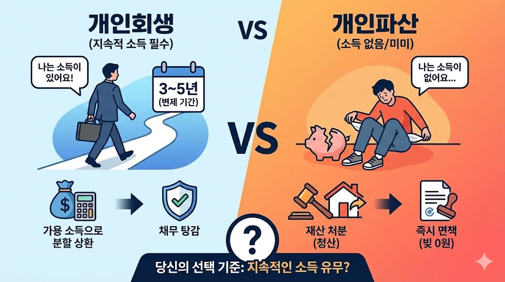 아래 이미지는 개인회생과 개인파산을 나누는 가장 결정적인 기준인 **'지속적인 소득 유무'**를 직관적으로 비교한 인포그래픽입니다. 왼쪽(파란색)은 소득이 있는 사람이 3~5년간 빚을 갚아 나가는 '개인회생' 과정을, 오른쪽(주황색)은 소득이 없어 재산을 처분하고 즉시 빚을 탕감받는 '개인파산' 과정을 보여줍니다. 독자가 자신의 상황에 맞는 제도를 한눈에 파악할 수 있도록 디자인했습니다.
