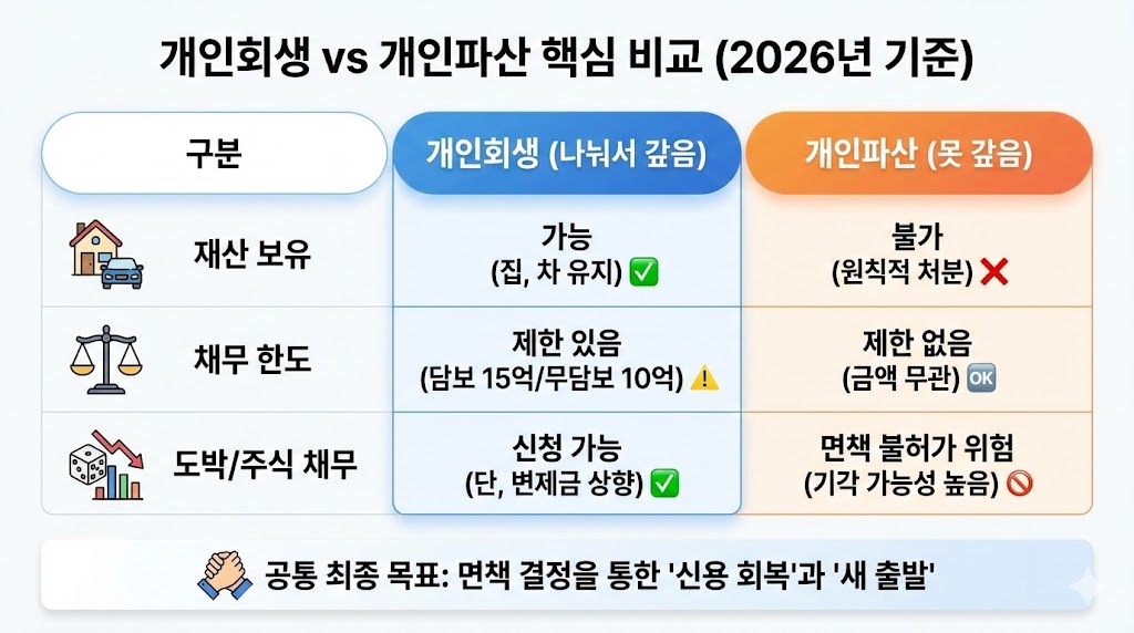 아래 이미지는 두 제도의 주요 차이점(재산 보유, 채무 한도, 도박/주식 채무 가능 여부)을 표 형식으로 정리한 인포그래픽입니다. 특히 최근 급증하는 **'도박/주식 투자 실패'**로 인한 채무가 개인회생에서는 가능하지만, 개인파산에서는 면책 불허가 사유가 될 수 있다는 점을 명확히 표시하여 독자들의 잘못된 판단을 방지하도록 도왔습니다.
