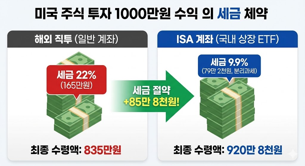 아래 이미지는 미국 주식 투자로 1,000만 원의 수익을 냈을 때, 해외 직투(일반 계좌)와 ISA 계좌(국내 상장 ETF)의 최종 수령액을 비교한 인포그래픽입니다. 해외 직투는 22%의 높은 세율로 인해 많은 세금을 내는 반면, ISA 계좌는 9.9%의 저율 분리과세로 세금을 크게 절약하여 최종적으로 더 많은 금액을 수령할 수 있음을 시각적으로 명확하게 보여줍니다.