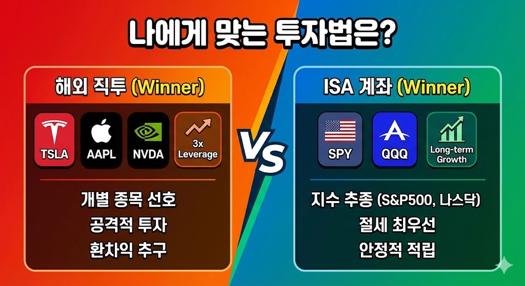 아래 이미지는 투자자의 성향에 따라 '해외 직투'와 'ISA 계좌' 중 어떤 것이 더 적합한지 비교하는 대결 구도의 이미지입니다. 개별 종목(테슬라, 애플 등)과 레버리지 투자를 선호하는 공격적인 투자자에게는 '해외 직투'를, 지수 추종 ETF(S&P500, 나스닥) 장기 투자와 절세를 중요시하는 안정적인 투자자에게는 'ISA 계좌'를 추천하는 내용을 담고 있습니다.