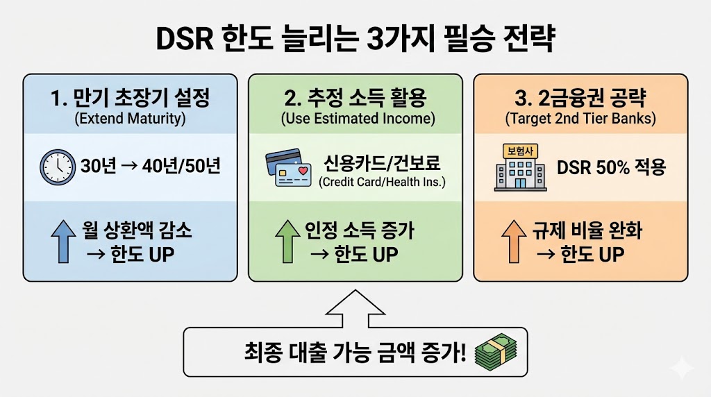 아래 이미지는 DSR 규제를 합법적으로 우회하여 대출 한도를 늘릴 수 있는 세 가지 핵심 전략(만기 연장, 추정 소득 활용, 2금융권 공략)을 알기 쉽게 도식화한 인포그래픽입니다. 각 전략의 원리와 결과적으로 어떻게 한도가 증가하는지를 단계별로 명확하게 보여주어 독자가 바로 따라 할 수 있는 가이드를 제공합니다.