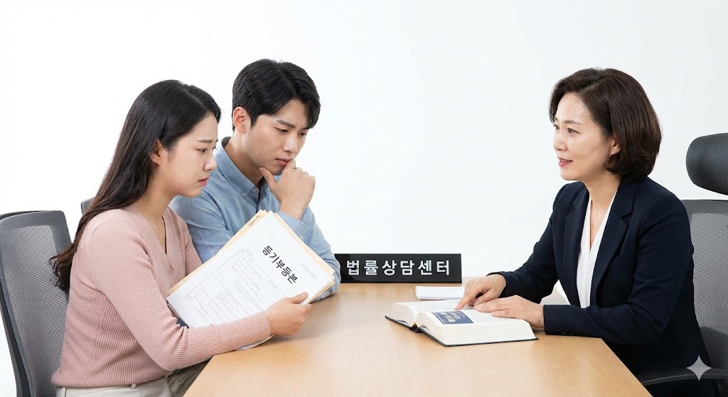 아래 이미지는 전세사기 피해로 불안해하는 청년 부부가 등기부등본 등 관련 서류를 들고 법률상담센터를 방문하여 전문가(변호사)와 상담하는 모습입니다.