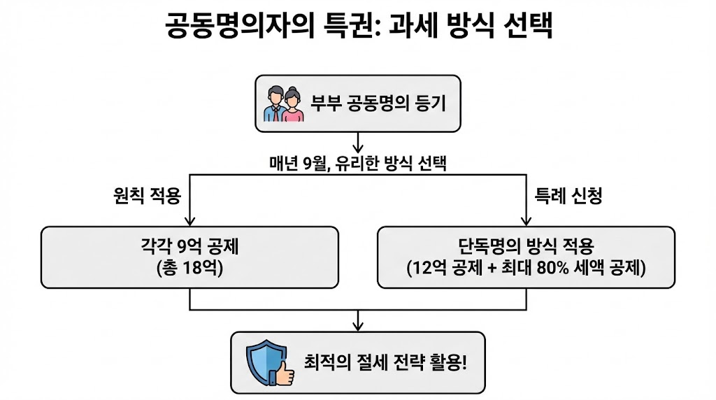 걱정하지 마십시오. 국세청은 **'특례 신청 제도(매년 9월)'**를 운영합니다. 부부가 공동명의로 등기되어 있더라도, 세금 낼 때는 '단독명의' 방식을 선택할 수 있습니다.