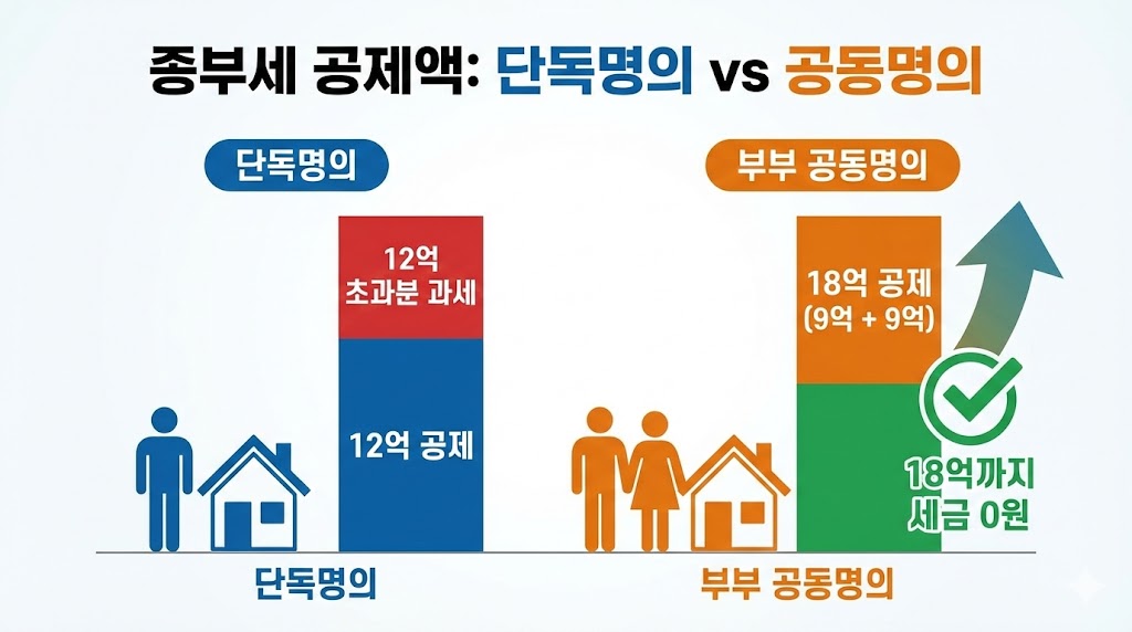종합부동산세 기본 공제액을 단독명의와 부부 공동명의로 나누어 비교한 인포그래픽입니다. 왼쪽 '단독명의'는 12억 원까지만 공제되고 초과분은 과세됨을 붉은색으로 표시한 반면, 오른쪽 '부부 공동명의'는 남편과 아내가 각각 9억 원씩 총 18억 원까지 공제받아 세금이 '0원'이 될 수 있음을 녹색 체크 표시와 함께 강조하여 보여줍니다.  왼쪽 '단독명의'는 12억 원까지만 공제되고 초과분은 과세됨을 붉은색으로 표시한 반면, 오른쪽 '부부 공동명의'는 남편과 아내가 각각 9억 원씩 총 18억 원까지 공제받아 세금이 '0원'이 될 수 있음을 녹색 체크 표시와 함께 강조하여 보여줍니다.