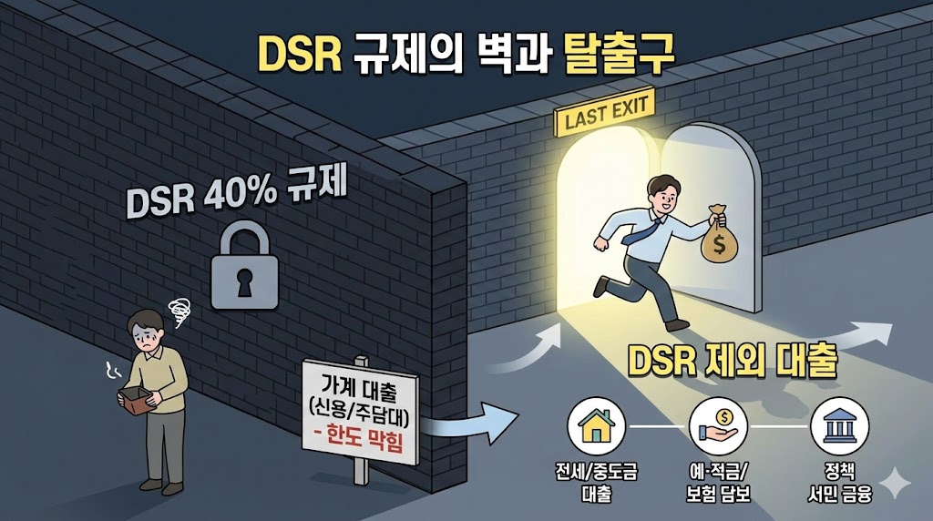 아래 이미지는 꽉 막힌 'DSR 40% 규제'를 넘지 못해 좌절하는 사람과, 그 벽에 난 '마지막 비상구(DSR 제외 대출)'를 통해 자금을 확보하고 웃으며 탈출하는 사람을 대비시켜 극적으로 표현한 인포그래픽입니다. DSR 제외 대출이 연봉과 상관없이 자금을 융통할 수 있는 합법적인 우회로임을 상징적으로 보여줍니다.