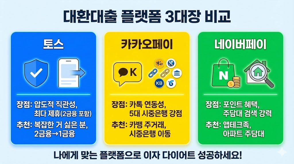 아래 이미지는 토스, 카카오페이, 네이버페이 등 주요 대환대출 플랫폼 3사의 장점과 추천 대상을 한눈에 비교한 인포그래픽입니다. 각 플랫폼의 대표 컬러(파랑, 노랑, 초록)를 사용하고, 직관적인 아이콘과 함께 핵심 특징을 요약하여 사용자가 자신에게 맞는 서비스를 쉽게 선택할 수 있도록 돕습니다.