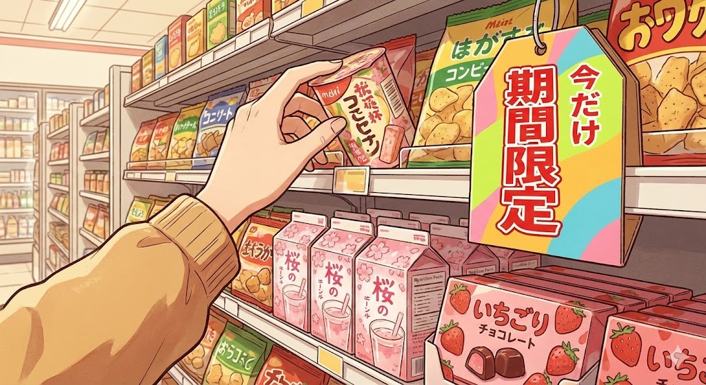 아래 이미지는 편의점 진열대에 붙어 있는 '기간 한정(期間限定)' 태그와 계절 과일(딸기, 벚꽃 등)이 그려진 스페셜 에디션 상품을 고르는 여행객의 손을 표현한 일러스트입니다. 일본 여행의 희소성을 강조하는 쇼핑 가이드 이미지입니다.