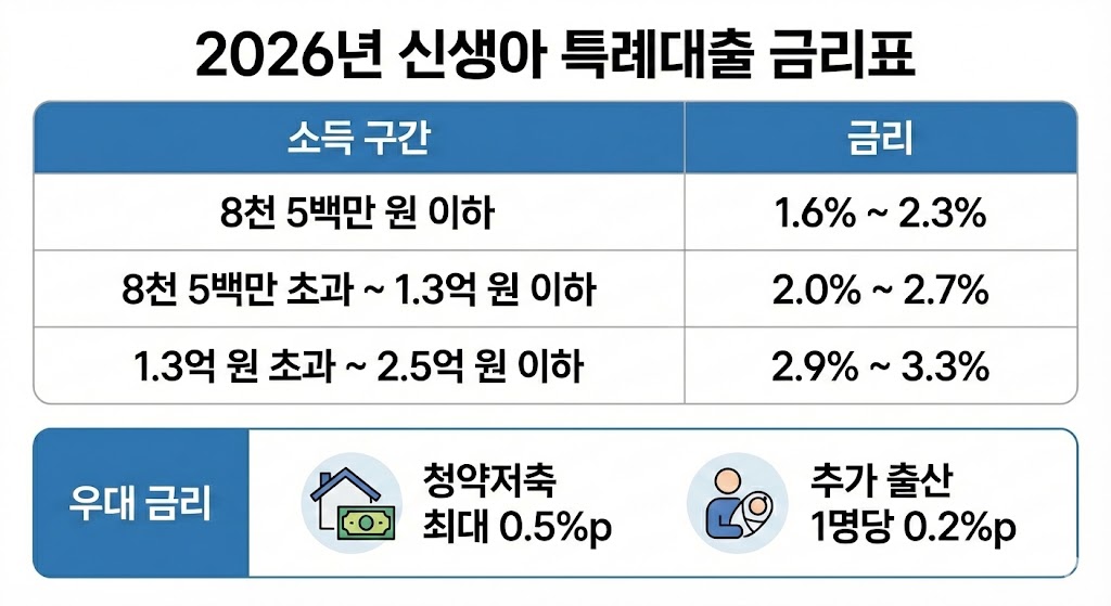 아래 이미지는 2026년 기준 신생아 특례대출의 소득 구간별 금리(최저 1.6% ~ 최고 3.3%)와 추가 우대 금리 조건(청약저축 가입 기간, 추가 출산 시 금리 인하)을 정리한 인포그래픽 표입니다.