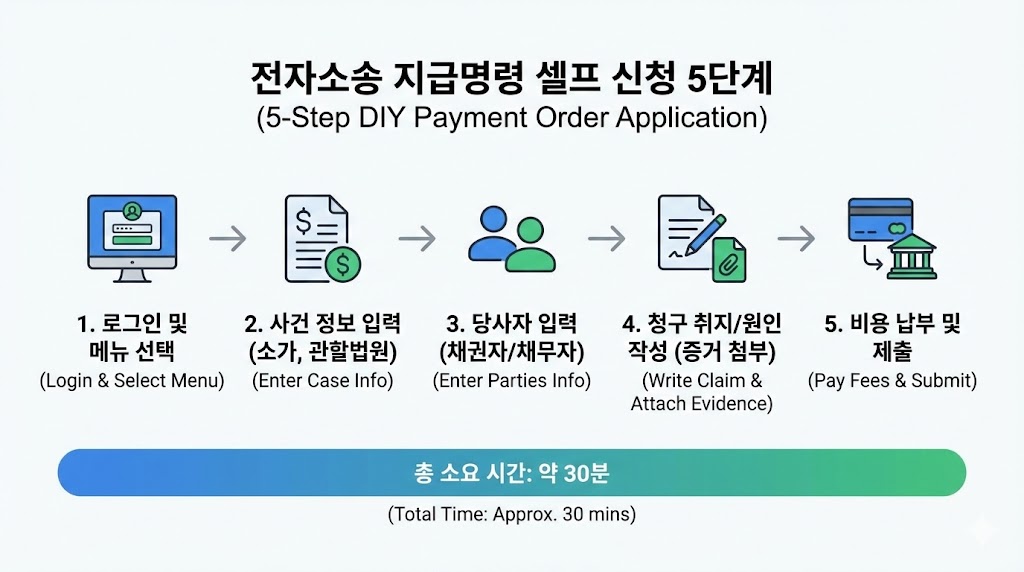 아래 이미지는 법무사 없이 집에서 혼자 전자소송 사이트를 통해 지급명령을 신청하는 과정을 5단계로 나누어 알기 쉽게 표현한 흐름도입니다. 각 단계별 핵심 행동(로그인, 정보 입력, 작성, 납부)을 아이콘과 함께 순서대로 배치하여, 처음 해보는 사람도 쉽게 따라 할 수 있도록 가이드 역할을 합니다.