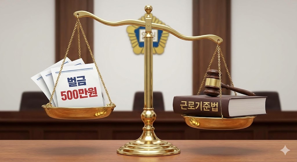 아래 이미지는 법원의 저울 위에 '벌금 500만 원' 고지서 뭉치와 '근로기준법' 법전이 올려져 있습니다.