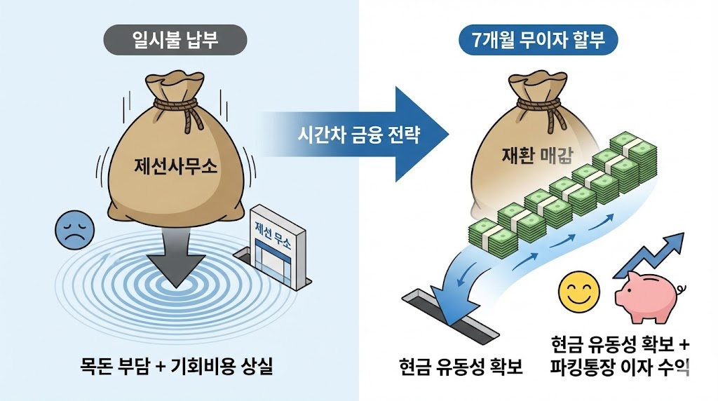 아래 이미지는 재산세를 일시불로 납부했을 때의 목돈 부담과 기회비용 상실을, 7개월 무이자 할부를 활용했을 때의 현금 유동성 확보 및 이자 수익 창출 효과와 직관적으로 비교한 인포그래픽입니다. '시간차 금융 전략'이라는 핵심 메시지를 시각화하여, 할부가 단순한 납부 유예가 아닌 재테크 수단임을 강조합니다.