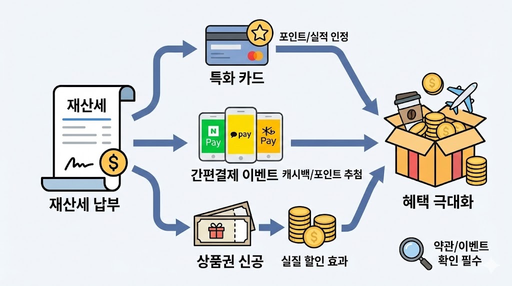 아래 이미지는 재산세 납부 시 혜택을 챙길 수 있는 세 가지 주요 방법(특화 카드, 간편결제 이벤트, 상품권 신공)을 하나의 흐름으로 정리한 인포그래픽입니다. 각 방법이 어떻게 혜택 극대화로 이어지는지 보여주며, 약관 및 이벤트 확인의 중요성을 강조하는 아이콘을 추가하여 실질적인 가이드를 제공합니다.