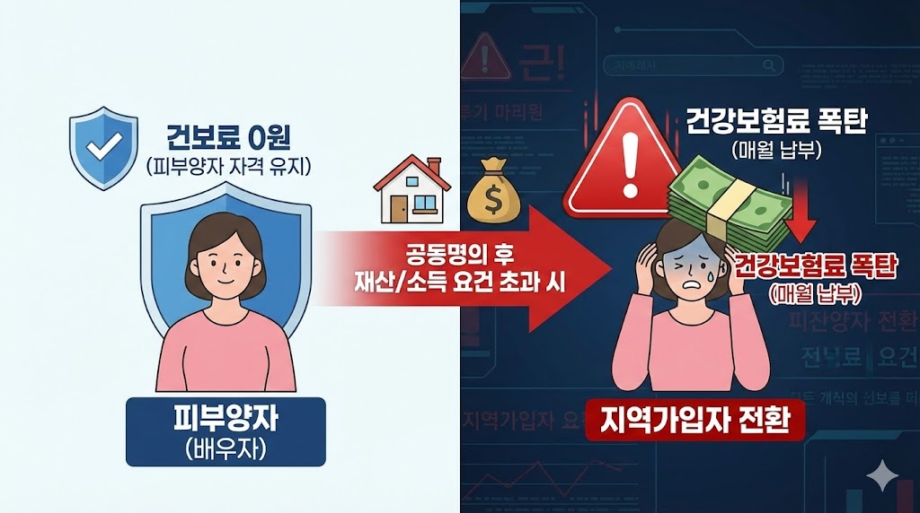 공동명의를 망설이게 하는 핵심 원인입니다. 소득이 없어 직장인 배우자의 **'피부양자'**로 등록되어 있던 사람이 공동명의로 부동산을 취득하면, 자격이 박탈되고 **'지역가입자'**로 전환되어 매달 건보료를 내야 할 수 있습니다.