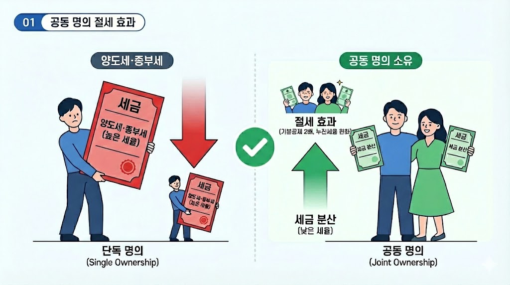 공동명의를 하는 가장 큰 이유는 바로 절세입니다. 대한민국 세법은 '인별 과세(사람마다 따로 계산)'를 원칙으로 하기 때문에, 명의를 나누면 세금 구간이 낮아지는 효과가 발생합니다.