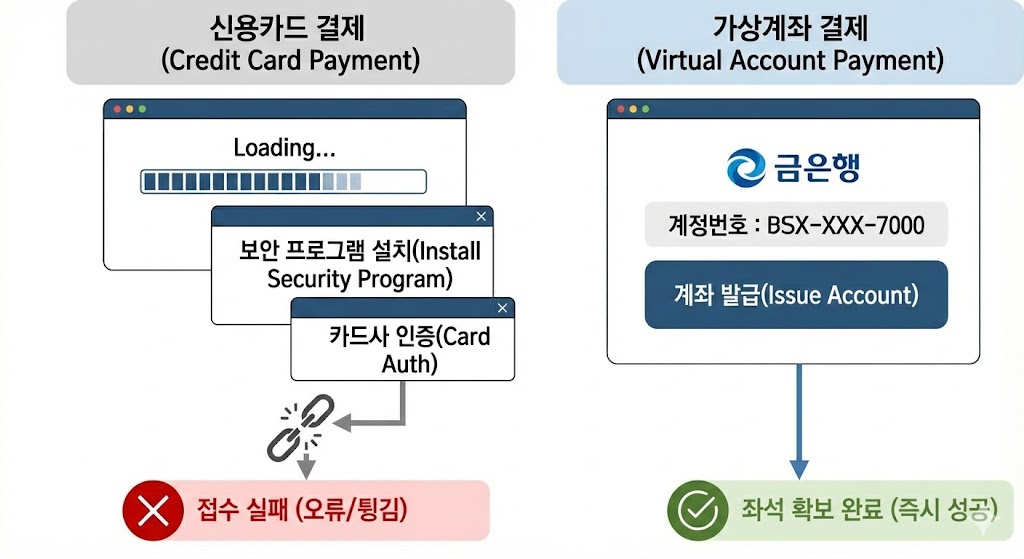 - 가상계좌의 장점: 비밀번호 입력이나 인증 절차 없이, 은행만 선택하면 즉시 접수가 완료됩니다. 입금은 나중에(보통 당일 오후 2시까지) 천천히 해도 접수 자리는 확보됩니다.