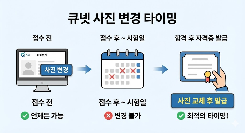 아래 이미지는 수험생들이 가장 궁금해하는 '사진 변경 가능 시기'를 3단계 타임라인으로 정리한 인포그래픽입니다. '접수 전(가능)', '시험 기간(불가)', '합격 후 자격증 발급 시(최적의 기회)'를 아이콘과 함께 명확하게 표시하여, 사진 변경을 원하는 수험생에게 정확한 정보를 제공합니다.