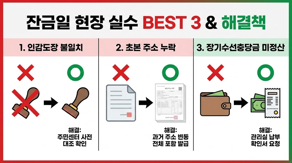 아래 이미지는 잔금 당일 현장에서 가장 빈번하게 발생하는 3가지 실수(인감도장 불일치, 초본 주소 누락, 장기수선충당금 미정산)를 붉은색 X 표시로 보여주고, 각 문제에 대한 올바른 해결책(주민센터 사전 대조, 과거 주소 포함 발급, 관리실 납부 확인서 요청)을 초록색 O 표시와 함께 제시하는 솔루션 인포그래픽입니다.