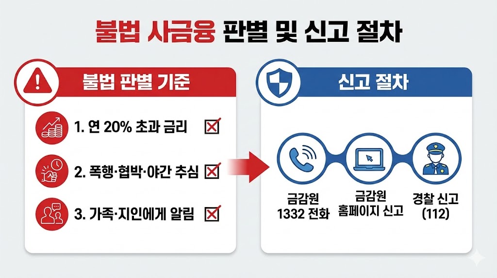 아래 이미지는 독자가 자신이 처한 상황이 불법 사금융 피해인지 즉시 확인할 수 있는 '판별 기준(연 20% 초과, 야간 추심 등)'과, 확인 후 바로 행동으로 옮길 수 있는 '신고 절차(1332, 금감원, 경찰)'를 하나의 이미지에 명확하게 담았습니다. 왼쪽의 위험(빨강)에서 오른쪽의 해결(파랑)로 이어지는 흐름을 통해 신고를 유도합니다.