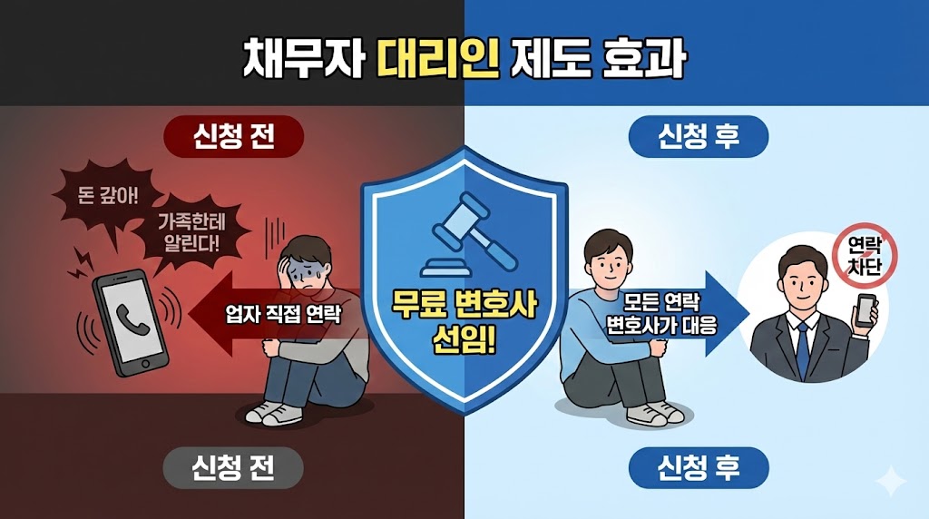 [그림 2] 채무자 대리인 제도(무료 변호사 지원)의 강력한 효과. 무료 변호사를 선임하면 사채업자의 모든 연락과 협박이 즉시 차단되고, 변호사가 대신 대응합니다.