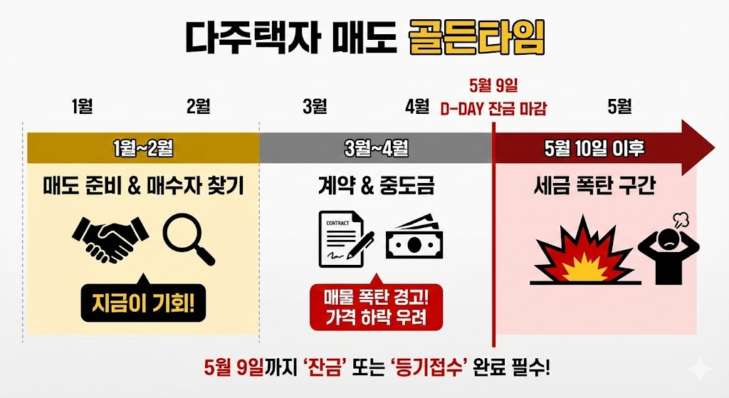 아래 이미지는 1월부터 5월까지의 '다주택자 매도 골든타임' 타임라인 인포그래픽입니다. 1~2월은 노란색으로 '지금이 기회! 매도 준비 & 매수자 찾기' 단계임을 강조하고, 3~4월은 '계약 & 중도금' 단계로 '매물 폭탄 경고! 가격 하락 우려'라는 메시지를 함께 전달합니다. 5월 9일에 붉은색 수직선으로 'D-DAY 잔금 마감'을 명시하고, 그 이후인 5월 10일부터는 '세금 폭탄 구간'으로 진입하여 매도자가 절망하는 모습을 보여줍니다. 하단에는 '5월 9일까지 잔금 또는 등기접수 완료 필수!'라는 핵심 행동 지침이 적혀 있습니다.