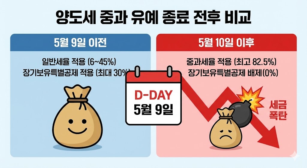 아래 이미지는 '양도세 중과 유예 종료 전후 비교' 인포그래픽입니다. 화면이 반으로 나뉘어 왼쪽(5월 9일 이전)은 파란색 배경에 '일반세율(6~45%) + 장특공제 적용' 문구와 함께 꽉 찬 돈주머니가 있어 수익 보전을 상징합니다. 반면, 오른쪽(5월 10일 이후)은 붉은색 경고 배경에 '중과세율(최고 82.5%) + 장특공제 0%' 문구와 함께 절반 이상 줄어든 돈주머니와 터지는 폭탄 아이콘이 배치되어 세금으로 인한 자산 손실을 직관적으로 보여줍니다.