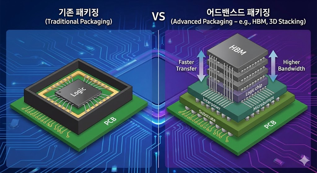 아래 이미지는 기존 패키징 기술과 최신 어드밴스드 패키징 기술을 비교한 인포그래픽입니다. 왼쪽의 '기존 패키징'은 단일 칩이 와이어로 연결된 평면적인 구조를 보여줍니다. 반면, 오른쪽의 '어드밴스드 패키징(HBM, 3D Stacking)'은 여러 개의 칩(HBM 등)이 수직으로 쌓이고 미세한 통로(TSV)로 연결된 입체적인 구조를 보여줍니다. 화살표와 텍스트를 통해 어드밴스드 패키징이 '더 빠른 전송 속도'와 '더 높은 대역폭'을 제공함을 강조합니다. 배경의 회로 기판 이미지는 첨단 기술의 느낌을 더합니다.