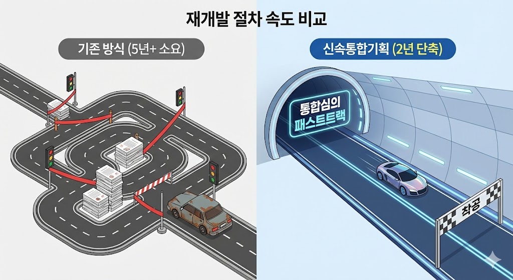 아래 이미지는 기존 재개발 방식과 신속통합기획 방식을 '도로'에 비유하여 속도 차이를 직관적으로 보여주는 인포그래픽입니다. 왼쪽의 '기존 방식'은 서류 더미와 신호등에 막혀 느리게 가는 구불구불한 길로 표현되었고, 오른쪽의 '신속통합기획'은 '통합심의 패스트트랙'이라는 터널을 통해 착공까지 직선으로 질주하는 모습으로 대조적으로 표현되어 2년 단축의 효과를 강조합니다.